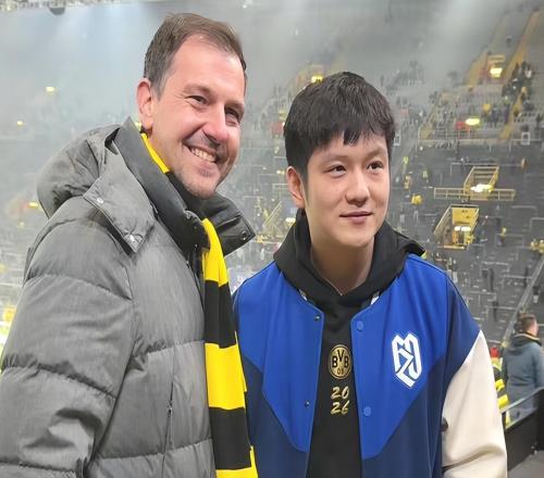 樊振东与波尔再看足球比赛,与多特蒙德主帅合影,喜笑颜开超开心