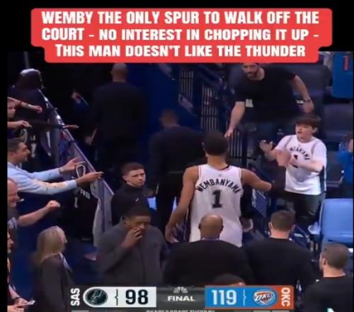 美媒点评道:“文班亚马是唯一一个没和对手握手的马刺球员,他是真不喜欢雷霆啊。”