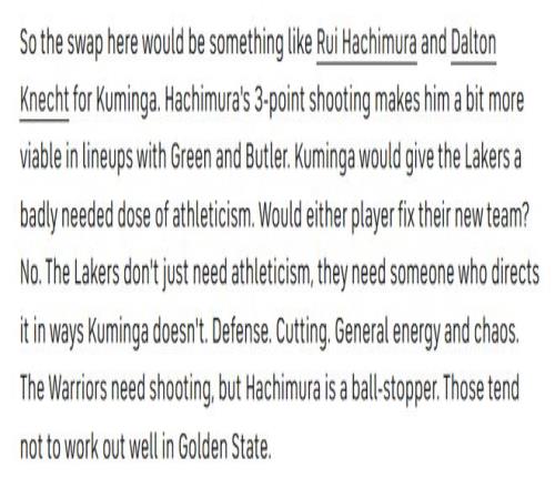 湖人不会放弃选秀权,也不会长期合同。如果他们要做交易动作,本质上不过是换汤不换药——用队内的到期合同去换取其他球队的到期合同,当然,最好是能补充球队现有阵容所欠缺的技术特点的球员。而库明加的合同下赛季为球队选项,实际上等同于一份到期合同。