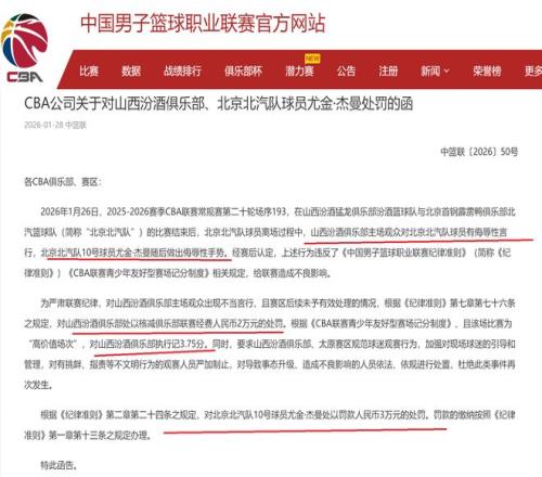 1月28日,下午5点!CBA公司给山西队开出一份罚单,同时,对北京队外援杰曼,也是进行了罚款!