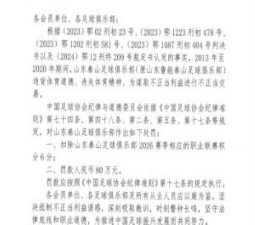 官方:山东泰山2013至2020年间进行不正当交易,扣6分+罚款80万元